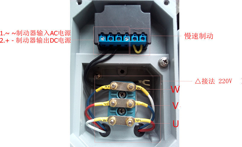 SEJ电机额定电压为380V,电磁铁的整流器输入交流额定电压为220V,额定频率均为50Hz,您可配好上述接线图进行安装。